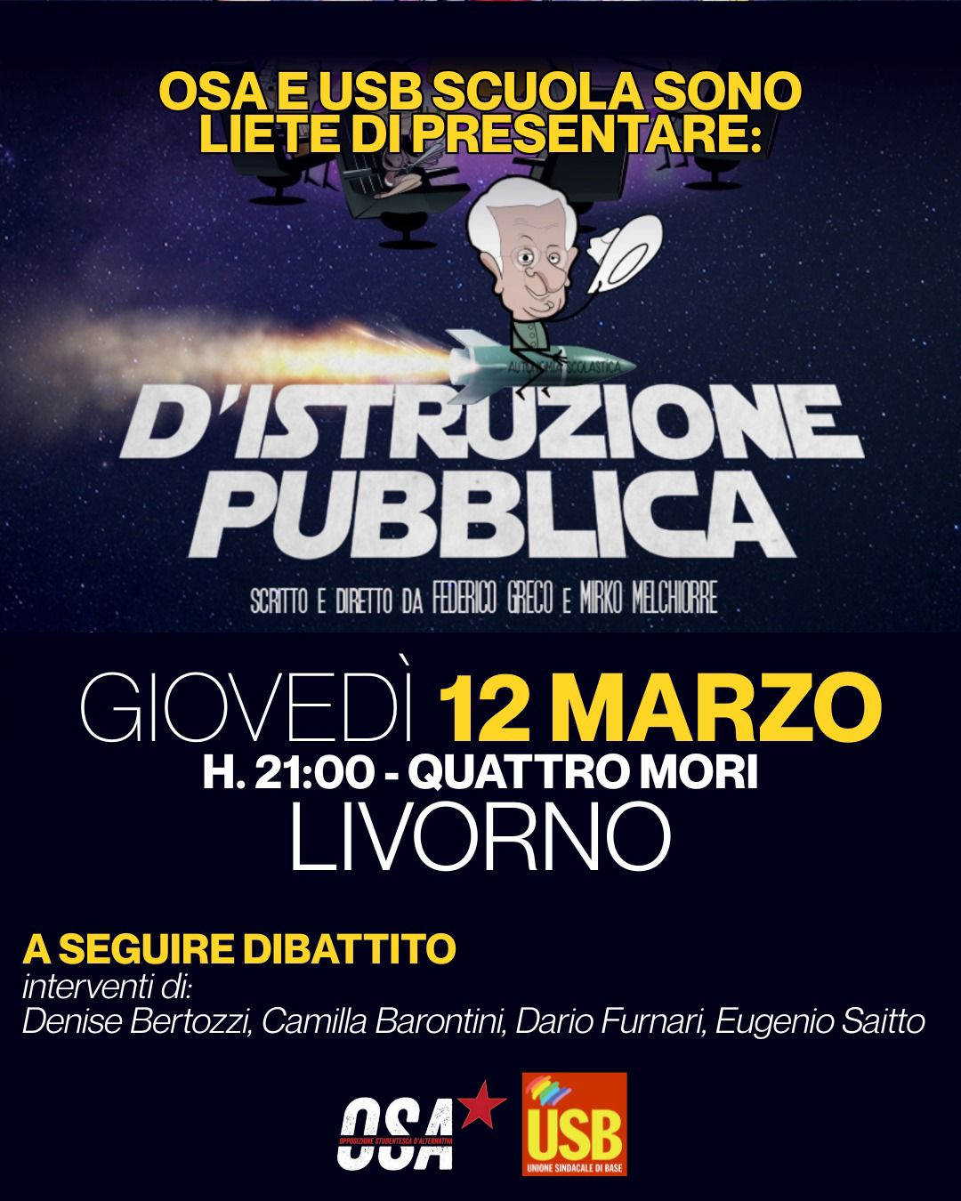 Giovedì 12 marzo, alle ore 21.00, ai Quattro Mori di LIVORNO, USB Scuola e OSA sono liete di presentare la proiezione del film “D’Istruzione pubblica”, documentario sullo smantellamento della scuola pubblica che sta suscitando grande interesse tra lavoratrici e lavoratori della scuola, tra le studentesse e gli studenti, ma anche tra le persone non direttamente coinvolte dai temi trattati.