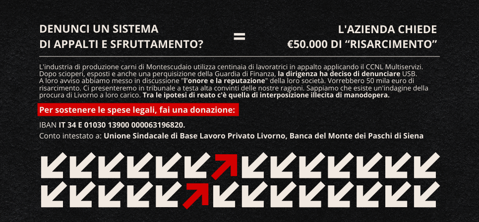L’industria di produzione carni di Montescudaio utilizza centinaia di lavoratrici in appalto applicando il CCNL Multiservizi: dopo scioperi, esposti e anche una perquisizione della Guardia di Finanza, la dirigenza ha deciso di denunciare il sindacato USB. A loro avviso abbiamo messo in discussione “l’onore e la reputazione” della loro società, vorrebbero 50 mila euro di risarcimento.