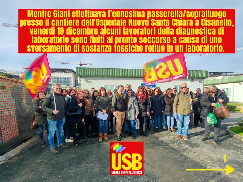 Mentre Giani effettuava l’ennesima passerella/sopralluogo presso il cantiere dell'Ospedale Nuovo Santa Chiara a Cisanello, venerdì 19 dicembre alcuni lavoratori della diagnostica di laboratorio sono finiti al pronto soccorso a causa di uno sversamento di sostanze tossiche reflue in un laboratorio.