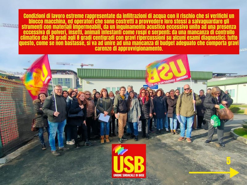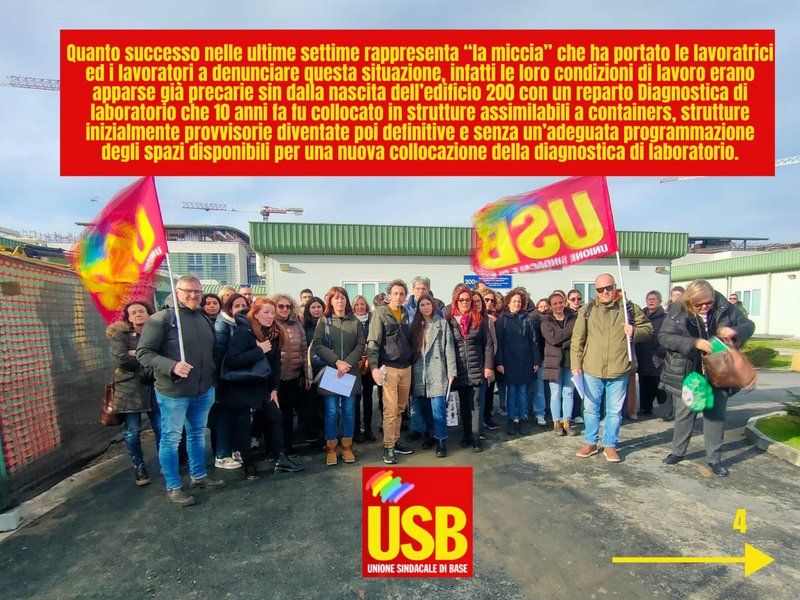 Quanto successo nelle ultime settime rappresenta “la miccia” che ha portato le lavoratrici ed i lavoratori a denunciare questa situazione, infatti le loro condizioni di lavoro erano apparse già precarie sin dalla nascita dell’edificio 200 con un reparto Diagnostica di laboratorio che 10 anni fa fu collocato in strutture assimilabili a containers, strutture inizialmente provvisorie diventate poi definitive e senza un’adeguata programmazione degli spazi disponibili per una nuova collocazione della diagnostica di laboratorio. Condizioni di lavoro estreme rappresentate da infiltrazioni di acqua con il rischio che si verifichi un blocco macchina, ed operatori che sono costretti a provvedere loro stessi a salvaguardare gli strumenti con materiali impermeabili, da un inquinamento acustico eccessivo unito ad una presenza eccessiva di polveri, insetti, animali infestanti come rospi e serpenti; da una mancanza di controllo climatico dai 38 gradi agli 8 gradi centigradi con gravi ripercussioni su alcuni esami diagnostici; tutto questo, come se non bastasse, si va ad unire ad una mancanza di budget adeguato che comporta gravi carenze di approvvigionamento.