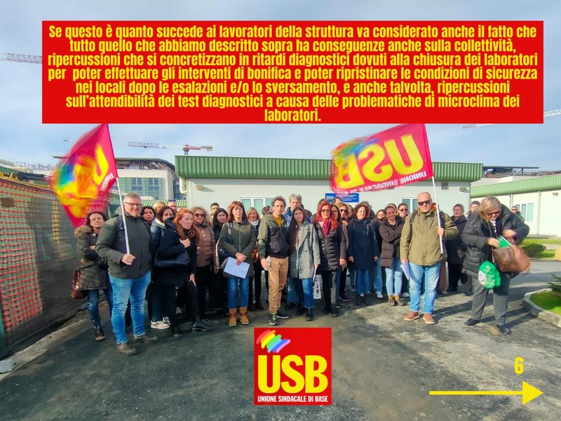 Se questo è quanto succede ai lavoratori della struttura va considerato anche il fatto che tutto quello che abbiamo descritto sopra ha conseguenze anche sulla collettività, ripercussioni che si concretizzano in ritardi diagnostici dovuti alla chiusura dei laboratori per poter effettuare gli interventi di bonifica e poter ripristinare le condizioni di sicurezza nei locali dopo le esalazioni e/o lo sversamento, e anche talvolta, ripercussioni sull’attendibilità dei test diagnostici a causa delle problematiche di microclima dei laboratori